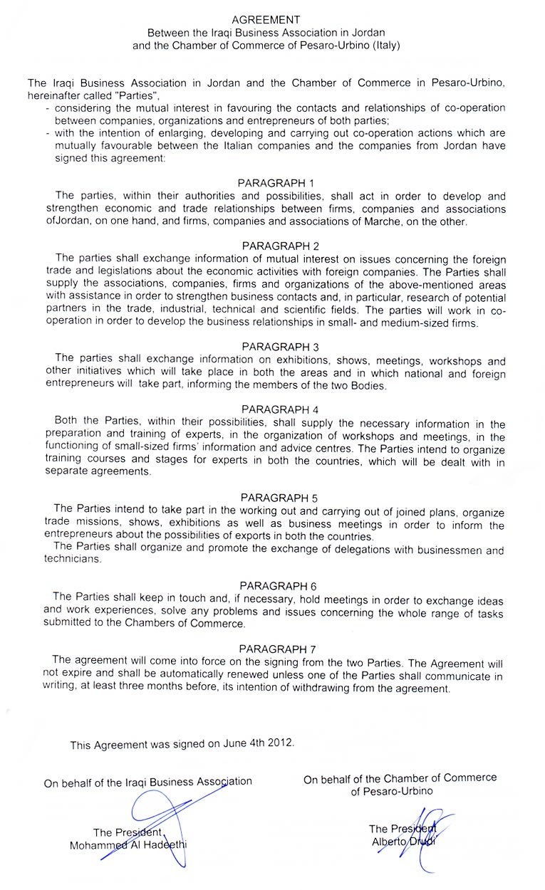 | Agreement between IBA and the chamber of commerce of Pesaro (Italy) |