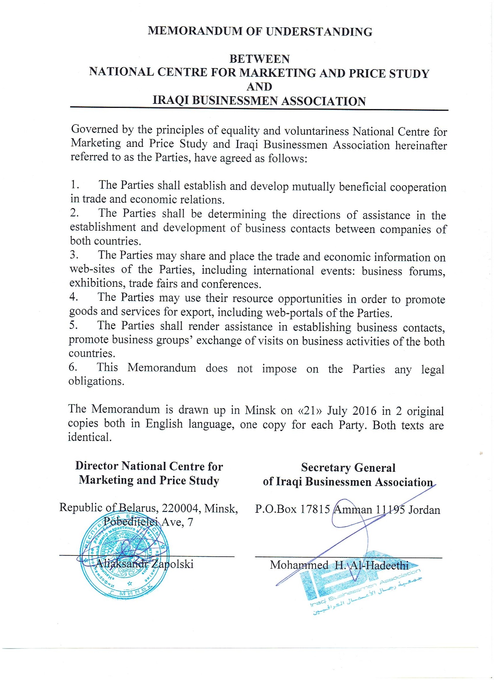 | MEMORANDUM OF UNDERSTANDING BETWEEN NATIONAL CENTRE FOR MARKETING AND PRICE STUDY AND IRAQ BUSINESSMEN ASSOCIATION |
